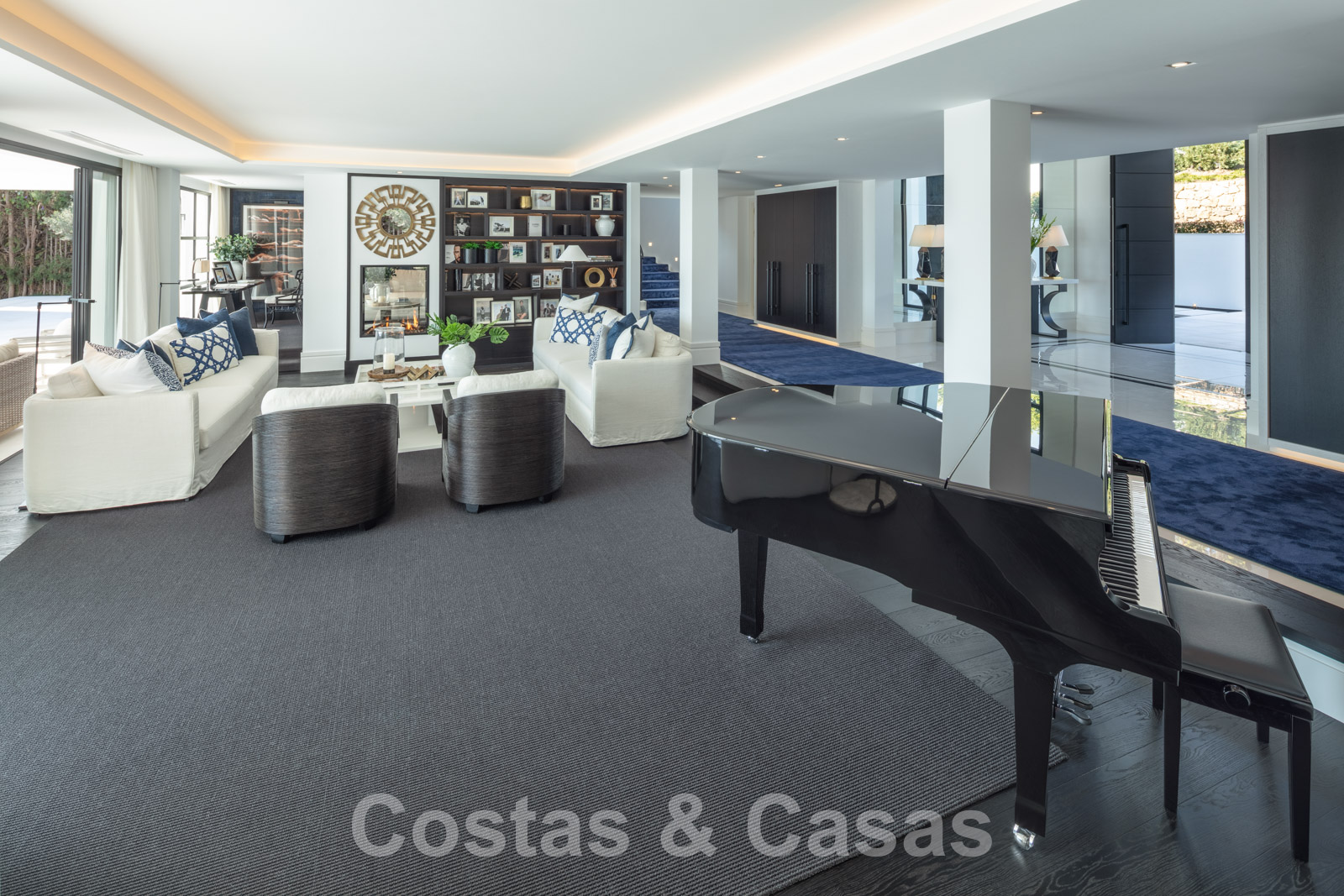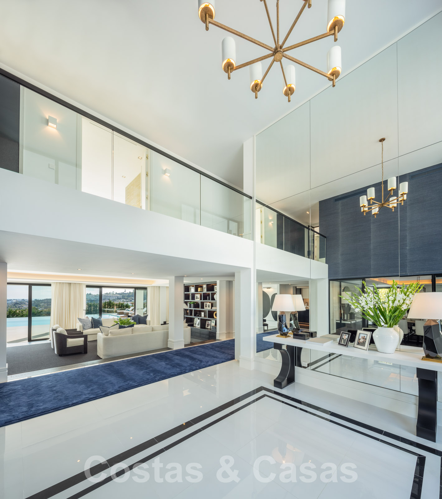 Planta baja Un portón motorizado da acceso al camino de entrada que desciende a una cochera para 2 coches y aparcamiento adicional para un 3er coche. La entrada está adornada con elementos de agua y una puerta principal de doble altura. El hall de entrada de doble altura se abre inmediatamente a una gran sala de estar con un despacho. Segundo salón con cocina de diseño totalmente equipada, zona de desayuno y una acogedora sala de TV. Comedor formal independiente. Dormitorio de invitados en suite. Cine en casa. Terrazas cubiertas y descubiertas con salones y zona de barbacoa. Una característica destacada es la piscina infinita arquitectónica con una terraza flotante, un lounge hundido y una casita de piscina que estará equipada con múltiples instalaciones chill-out.