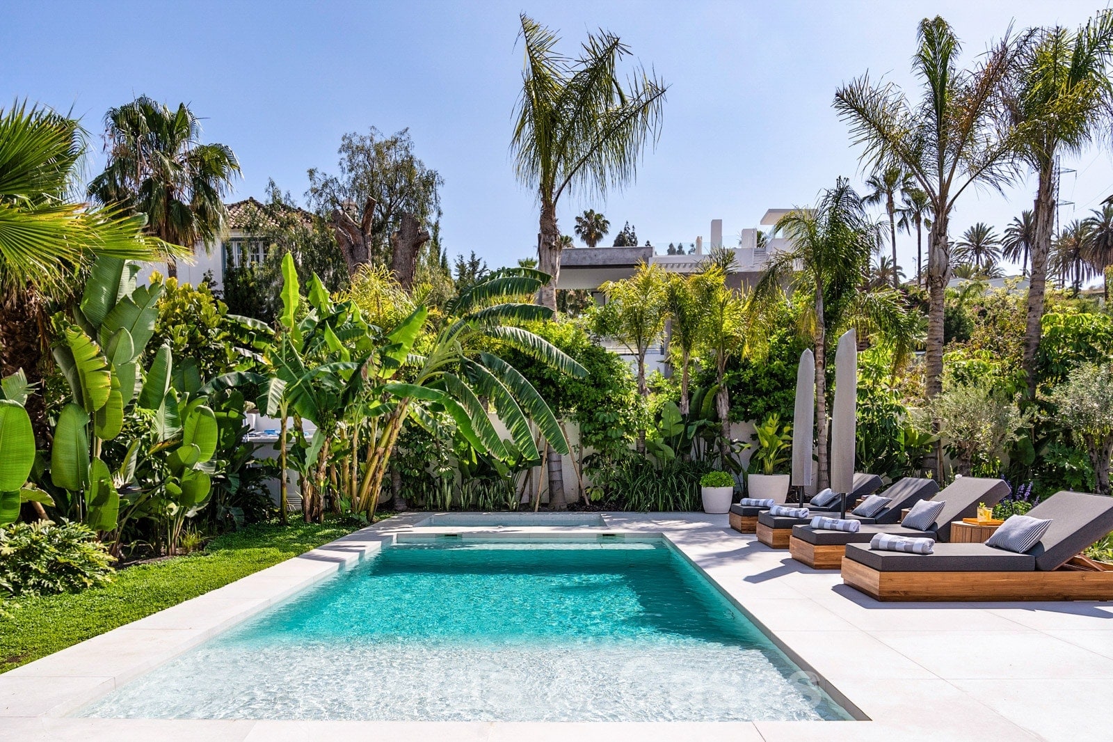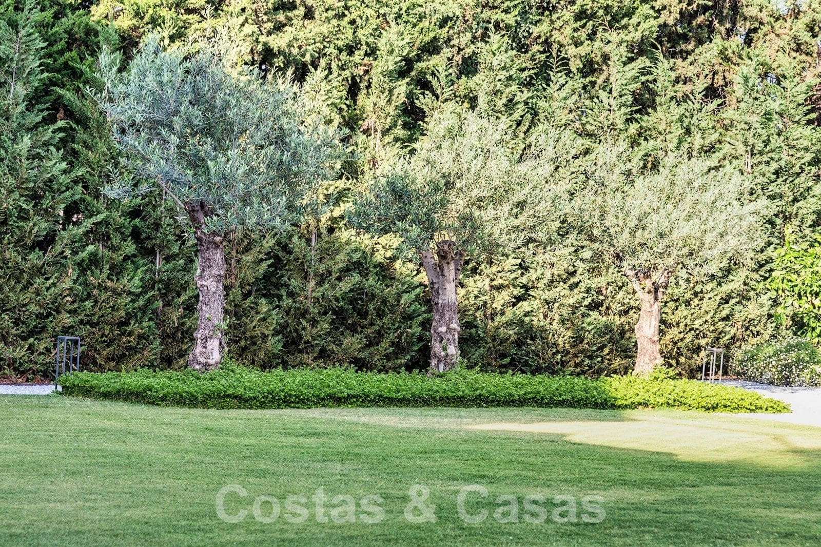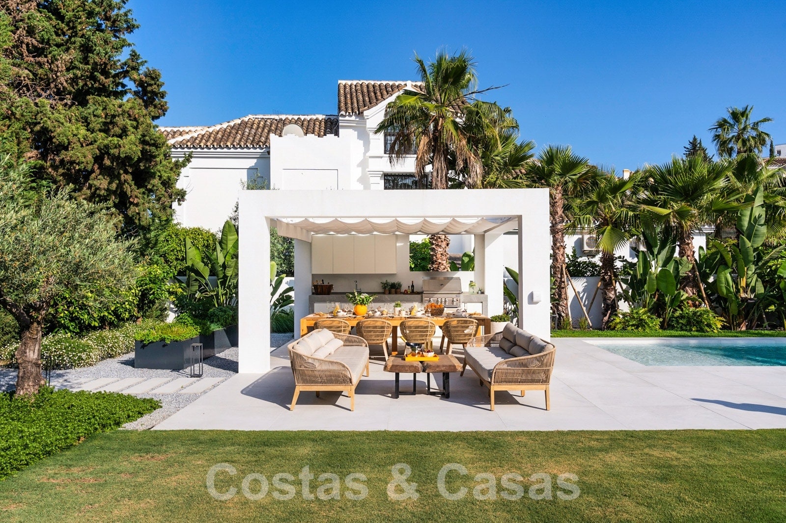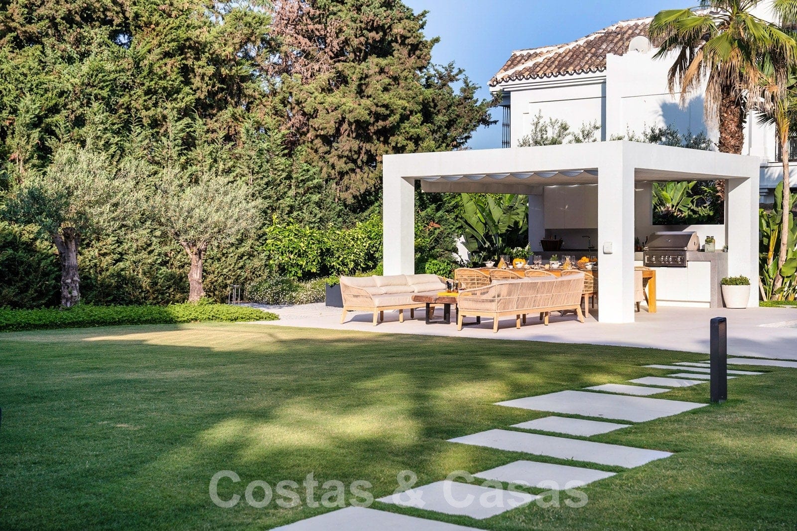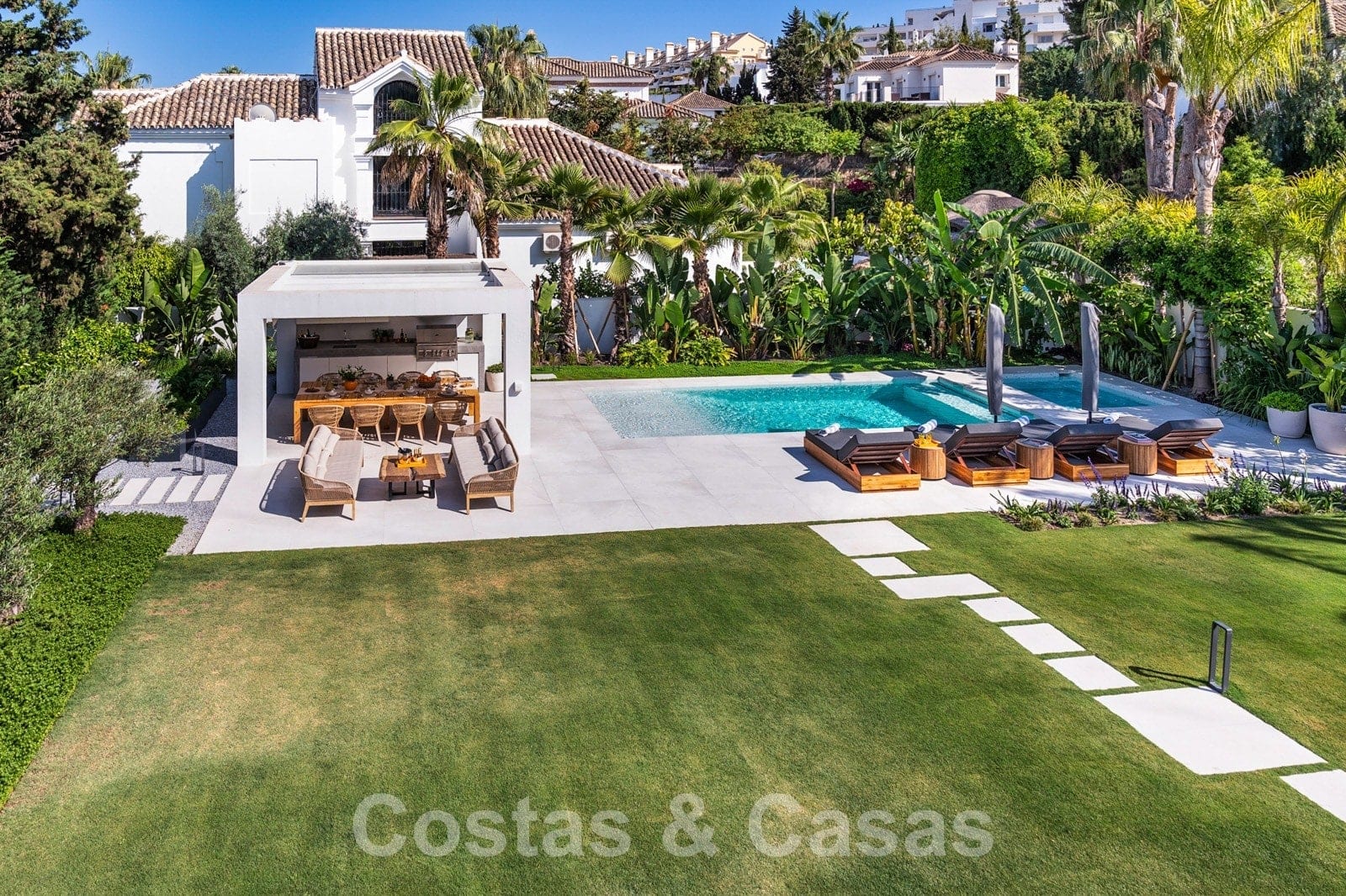 Parcela espaciosa, completamente rodeada de plantaciones altas. Un cuidado jardín paisajístico con exuberante vegetación y mucho césped crea un ambiente mediterráneo y relajante. Piscina tipo laguna climatizada con jacuzzi rodeada de solárium. Una casa de piscina con cocina al aire libre, barbacoa y comedor al aire libre.