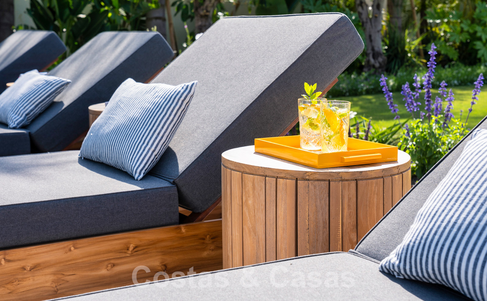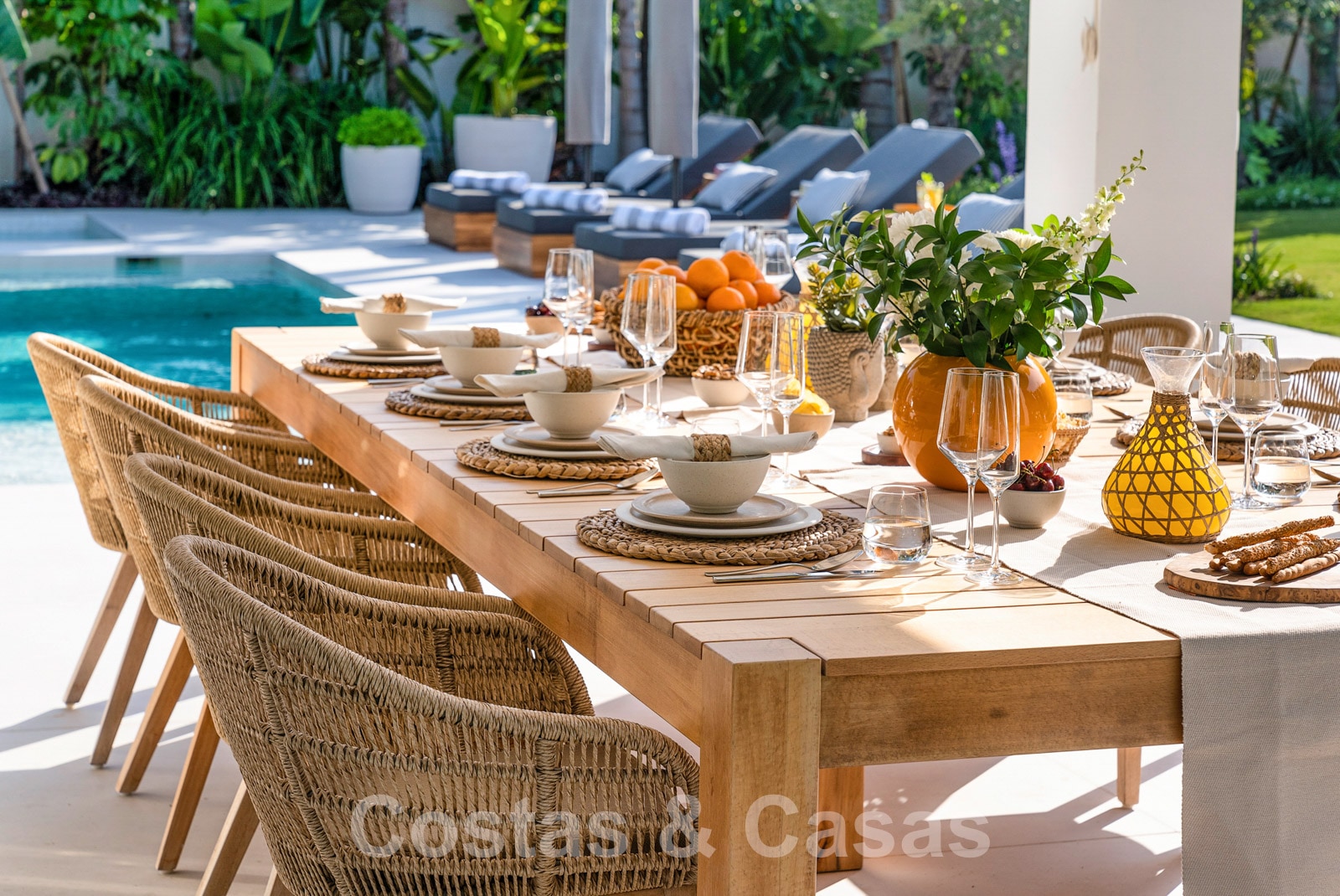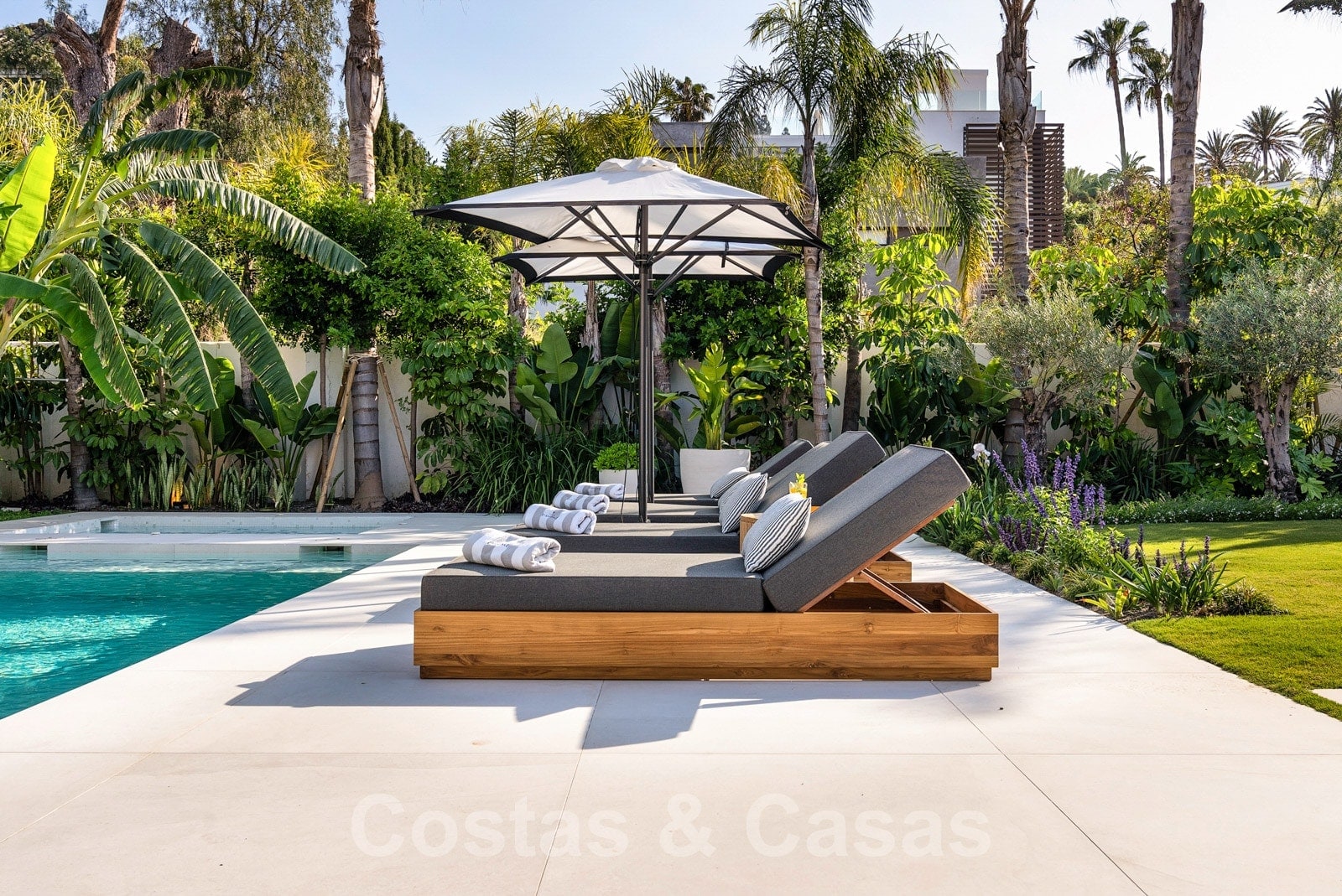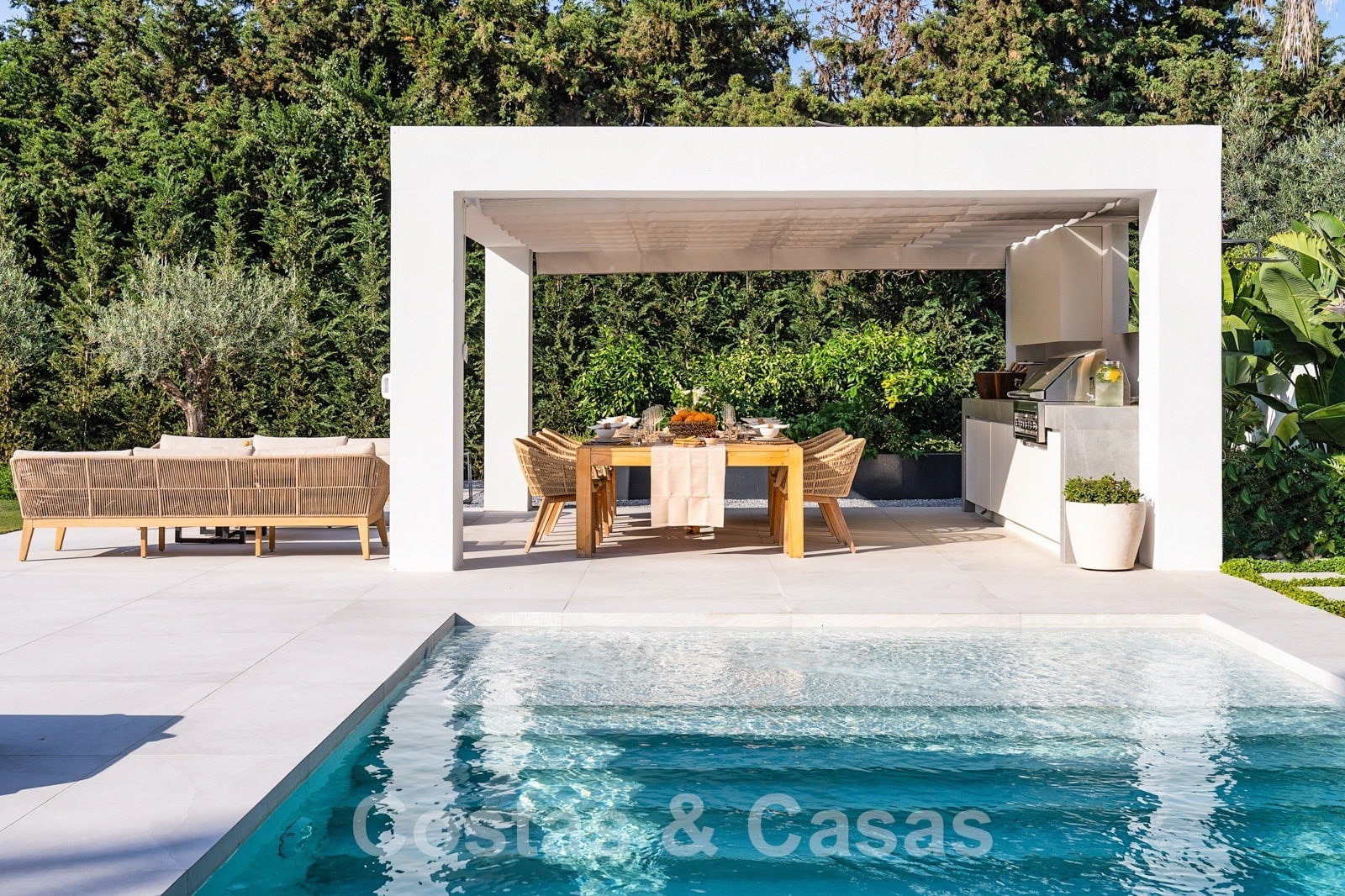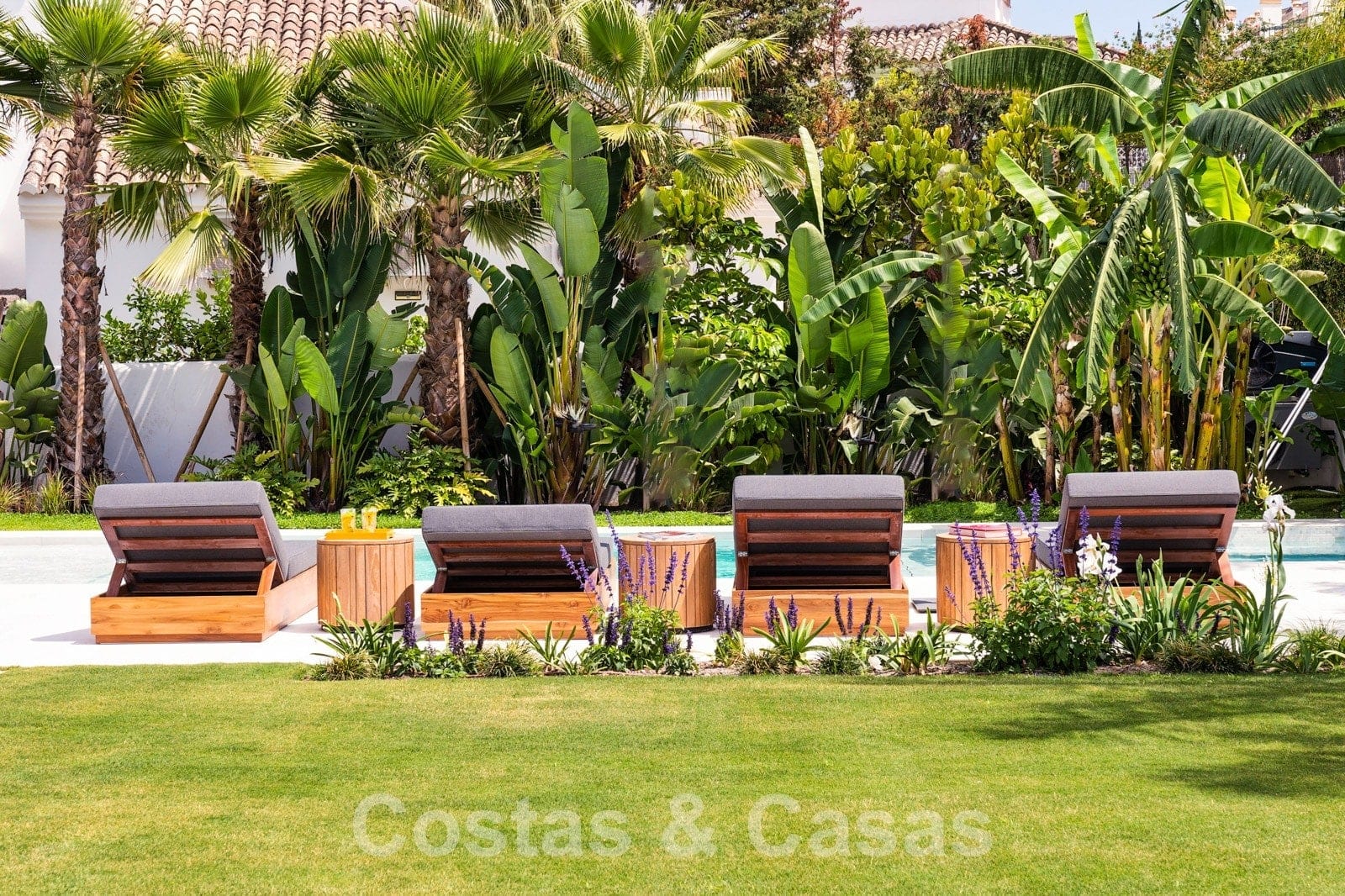 Parcela espaciosa, completamente rodeada de plantaciones altas. Un cuidado jardín paisajístico con exuberante vegetación y mucho césped crea un ambiente mediterráneo y relajante. Piscina tipo laguna climatizada con jacuzzi rodeada de solárium. Una casa de piscina con cocina al aire libre, barbacoa y comedor al aire libre.