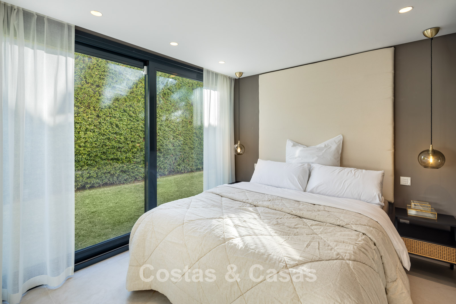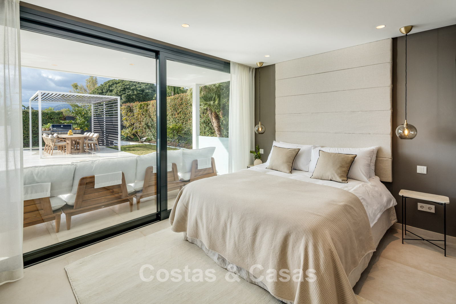 Las ventanas corredizas altas con marcos empotrados brindan una transición perfecta entre los espacios interiores y exteriores y también generan mucha luz natural.