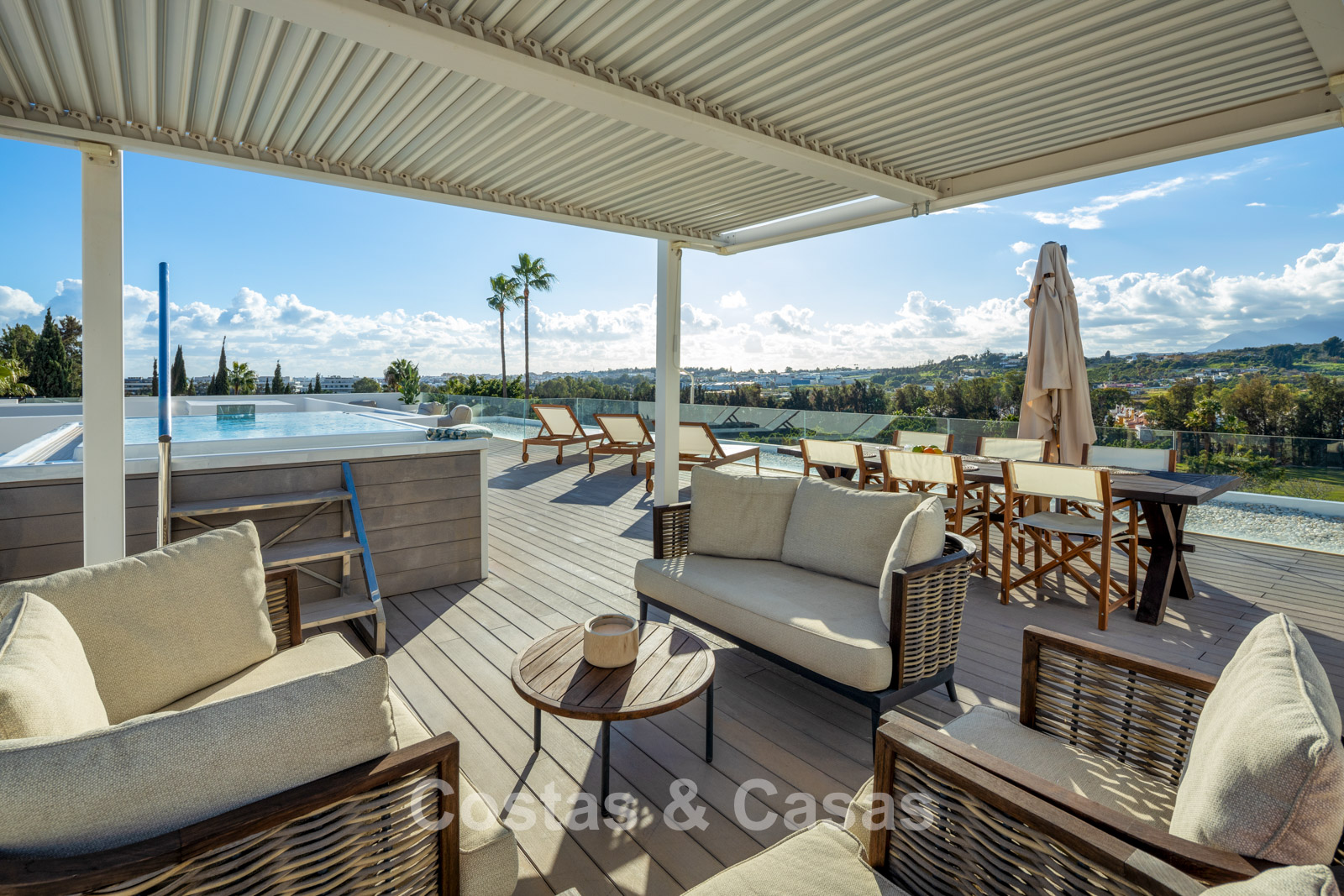 Un amplio solárium cuenta con un jacuzzi y diversas opciones de relajación.