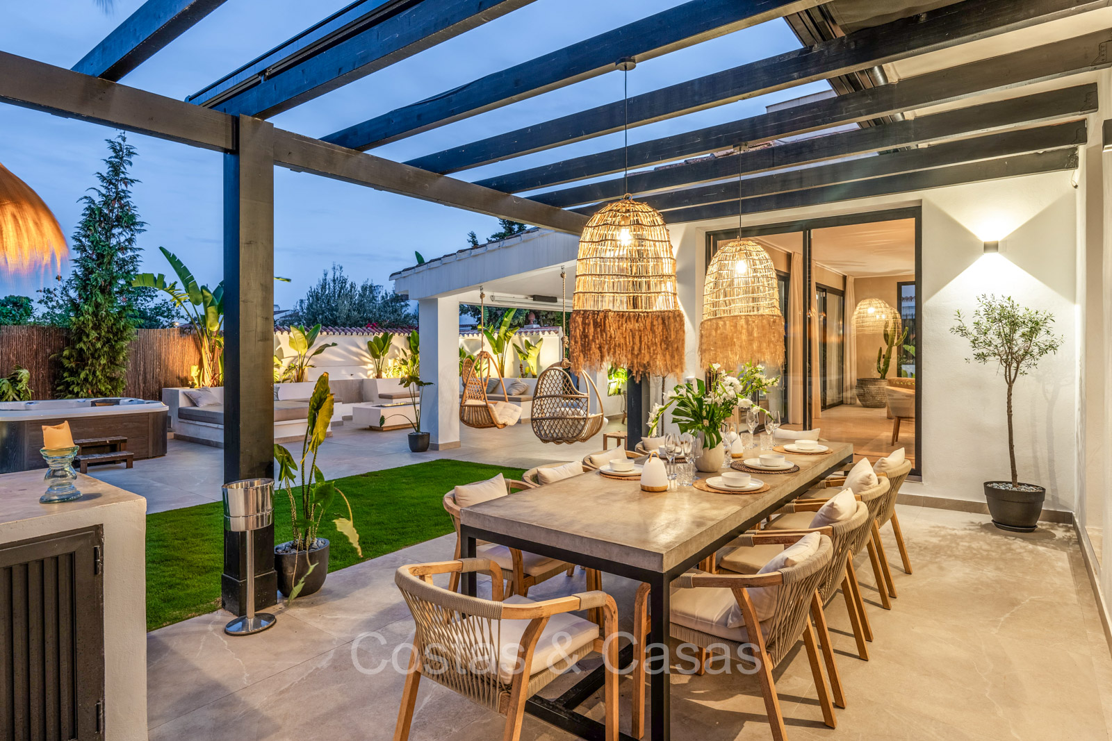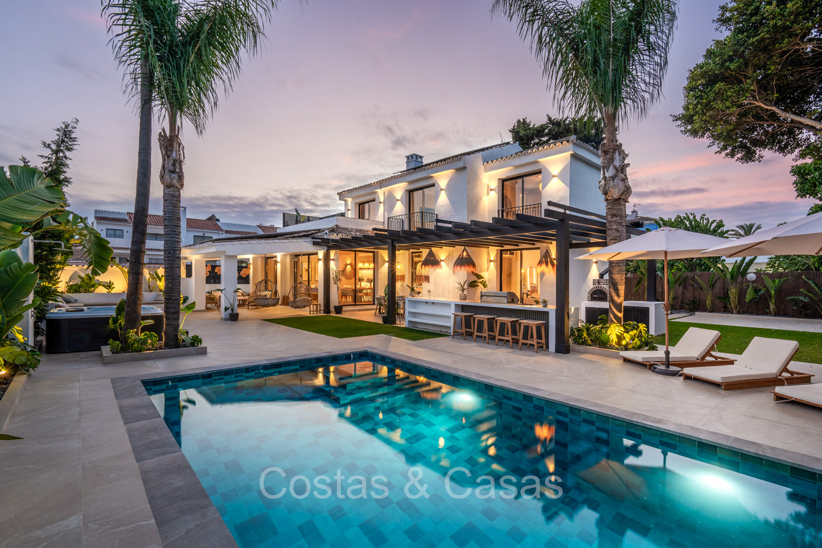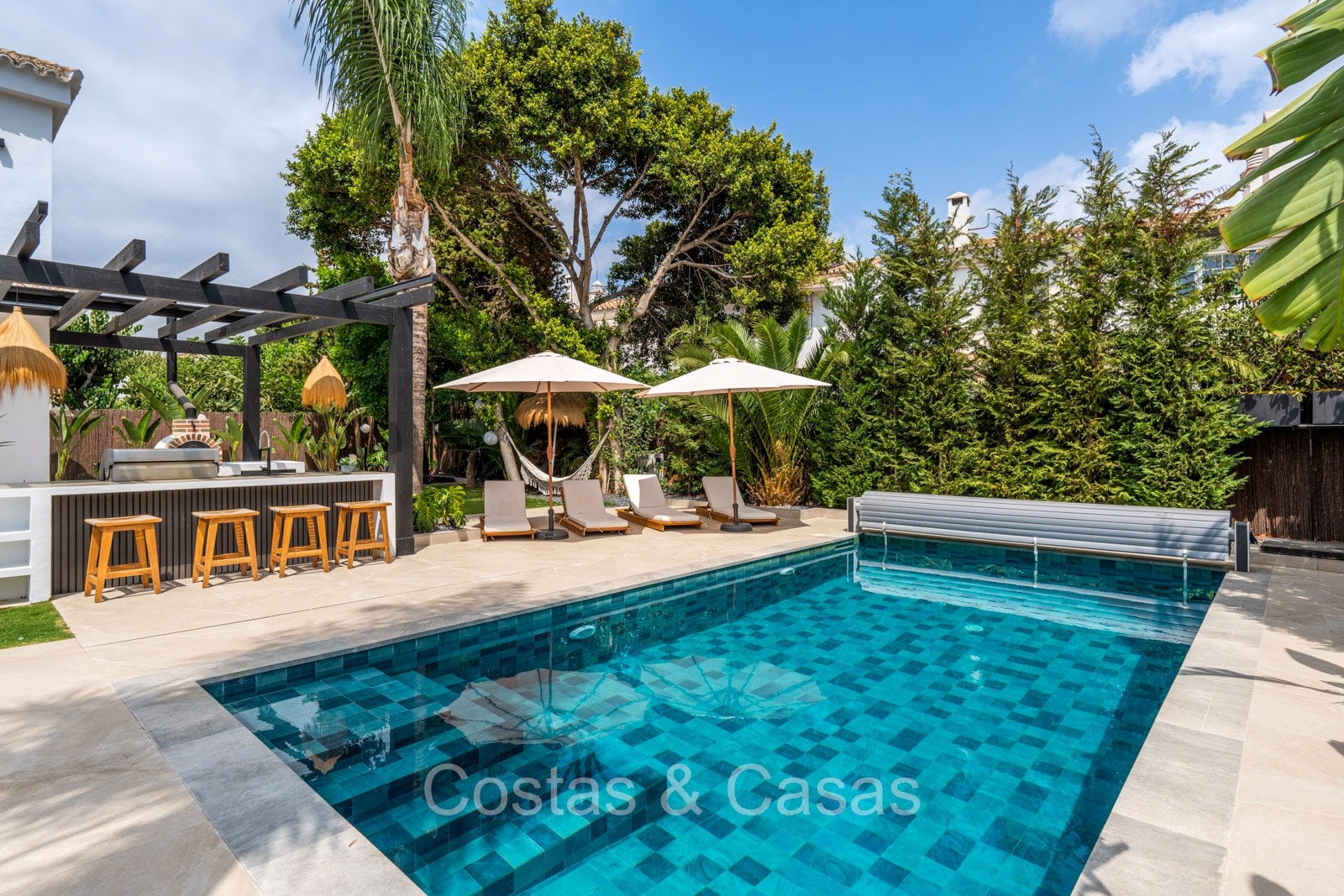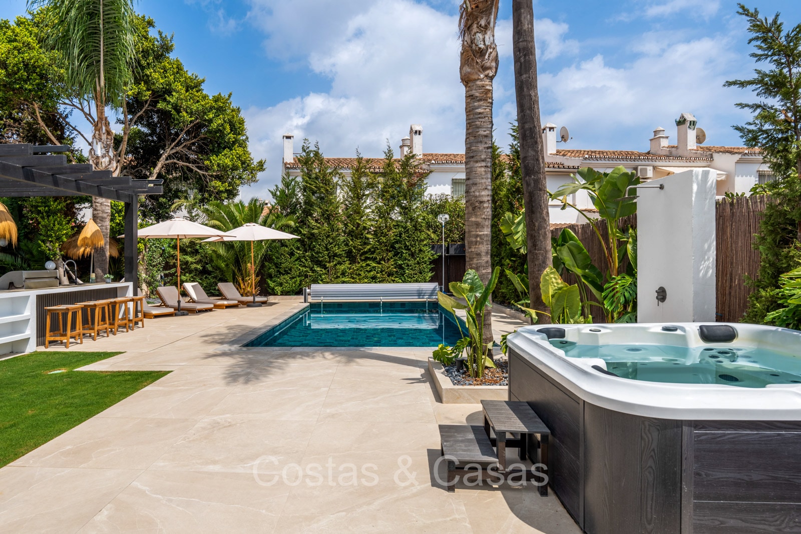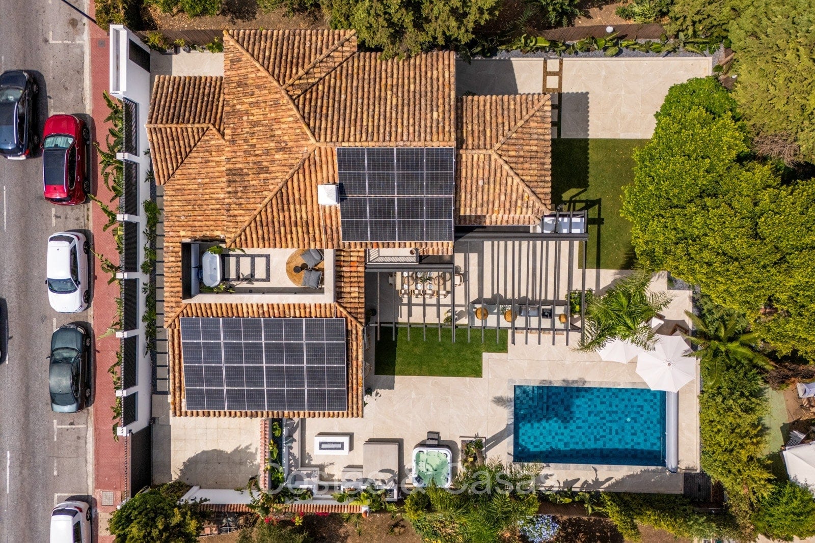 Amplia parcela, rodeada de plantaciones verdes. Arquitectura exterior de alta calidad con plantas y césped. Piscina privada balinesa climatizada con cubierta protectora integrada. Terraza pérgola automática con cocina exterior con barbacoa, horno de pizza, bar y zona de comedor al aire libre. Las amplias terrazas ofrecen instalaciones de relax y un jacuzzi. Un proyector instalado para acogedoras noches de cine al aire libre. Orientación sur.