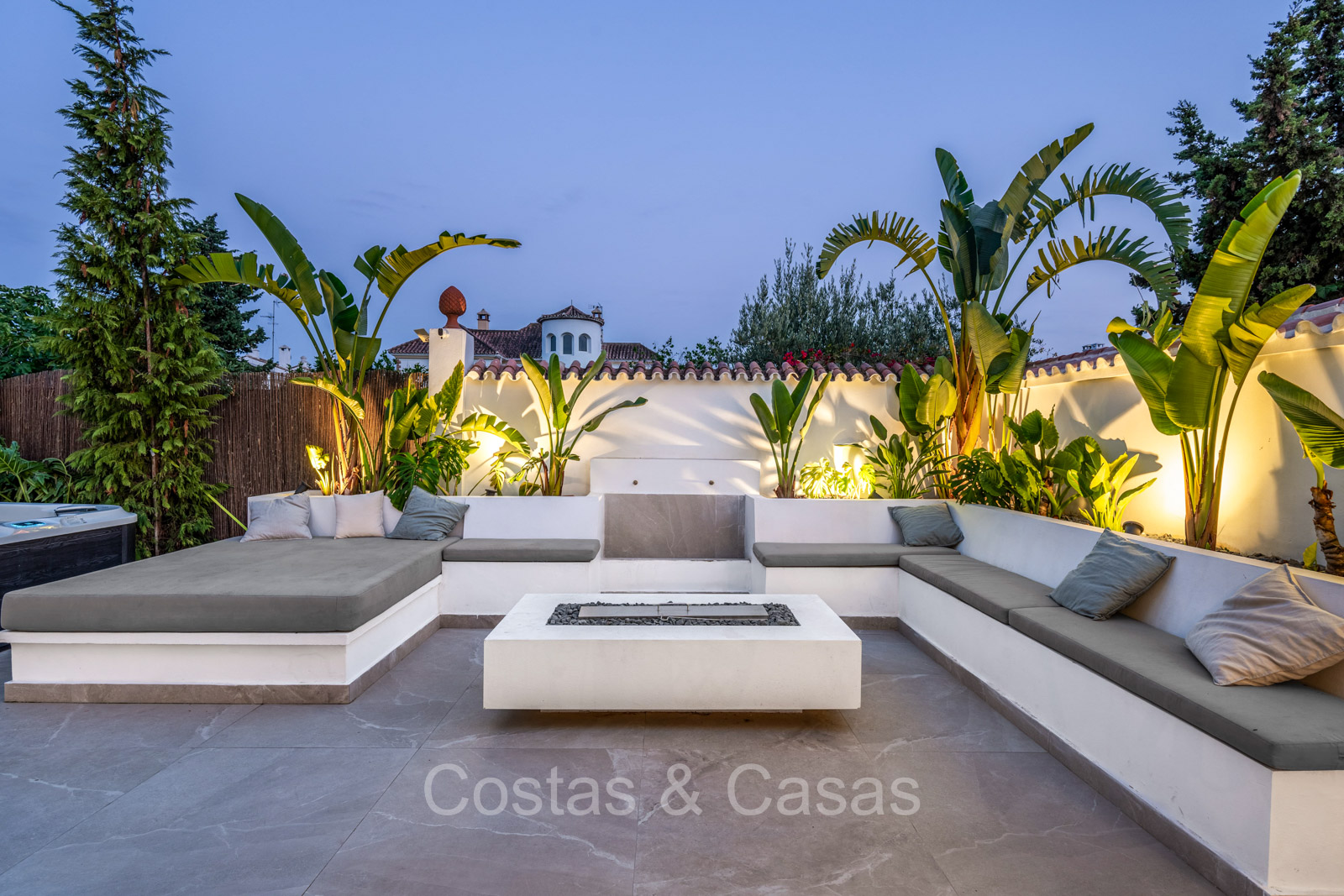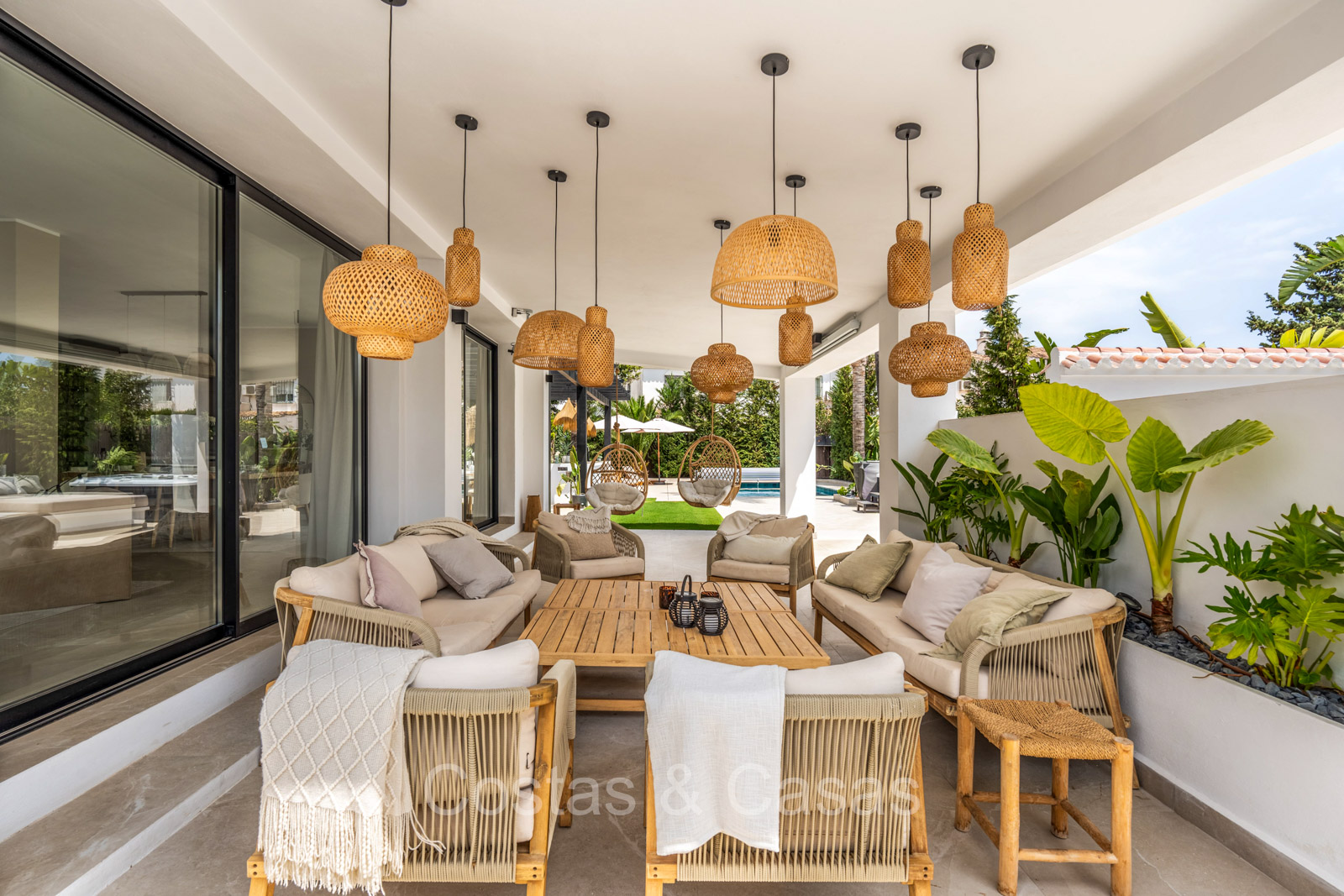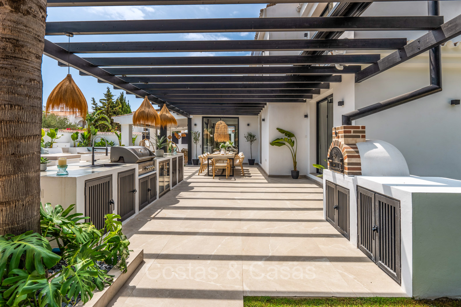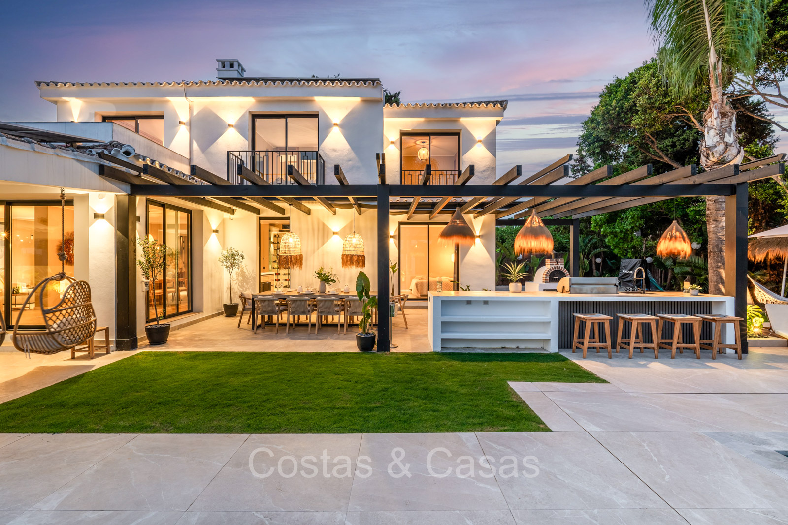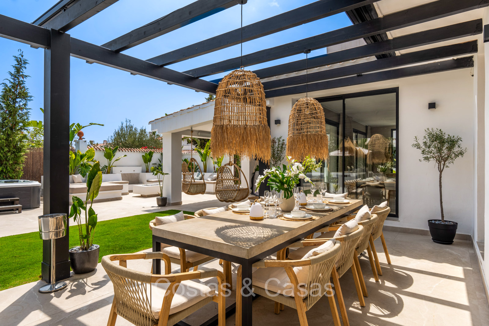 Amplia parcela, rodeada de plantaciones verdes. Arquitectura exterior de alta calidad con plantas y césped. Piscina privada balinesa climatizada con cubierta protectora integrada. Terraza pérgola automática con cocina exterior con barbacoa, horno de pizza, bar y zona de comedor al aire libre. Las amplias terrazas ofrecen instalaciones de relax y un jacuzzi. Un proyector instalado para acogedoras noches de cine al aire libre. Orientación sur.