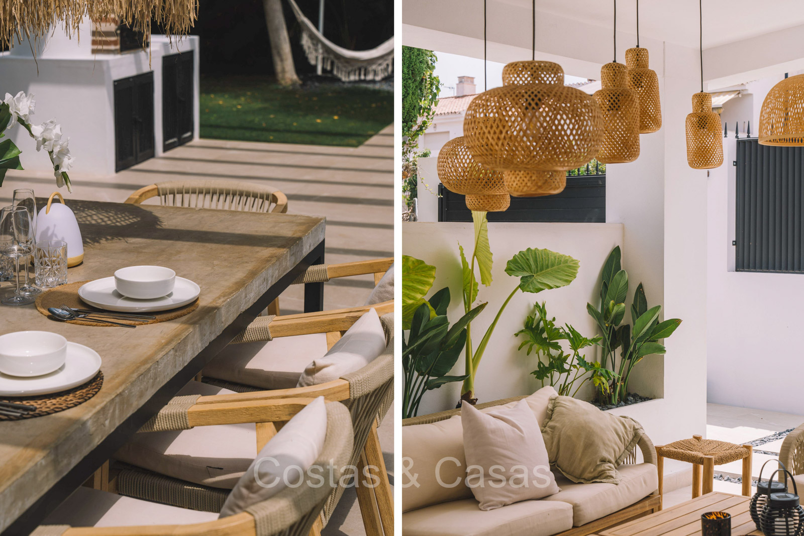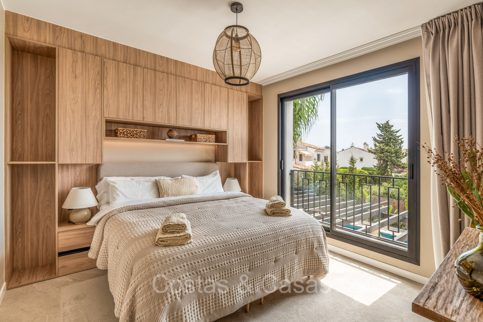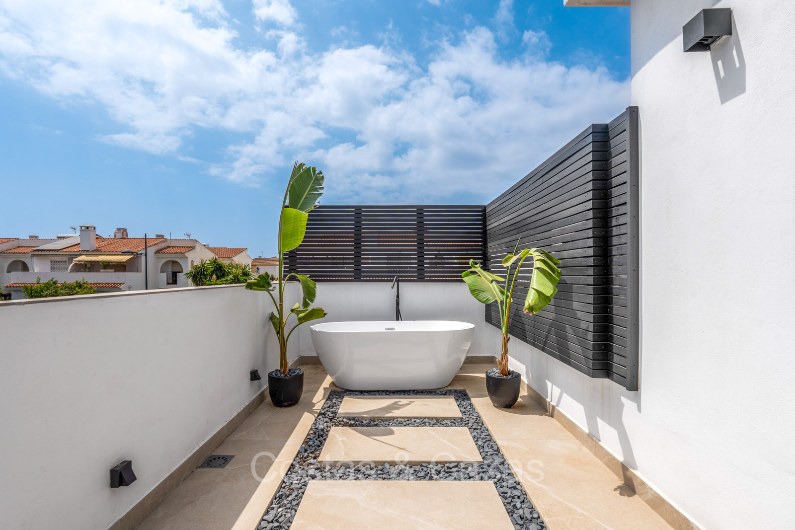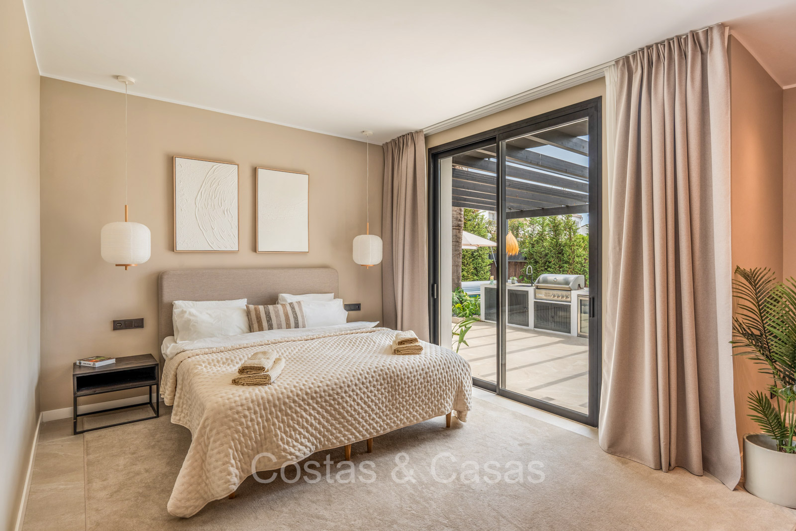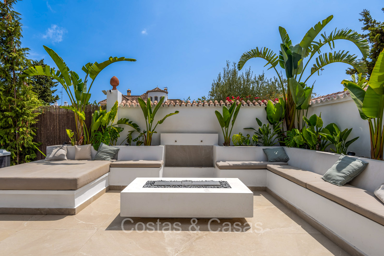 Amplia parcela, rodeada de plantaciones verdes. Arquitectura exterior de alta calidad con plantas y césped. Piscina privada balinesa climatizada con cubierta protectora integrada. Terraza pérgola automática con cocina exterior con barbacoa, horno de pizza, bar y zona de comedor al aire libre. Las amplias terrazas ofrecen instalaciones de relax y un jacuzzi. Un proyector instalado para acogedoras noches de cine al aire libre. Orientación sur.