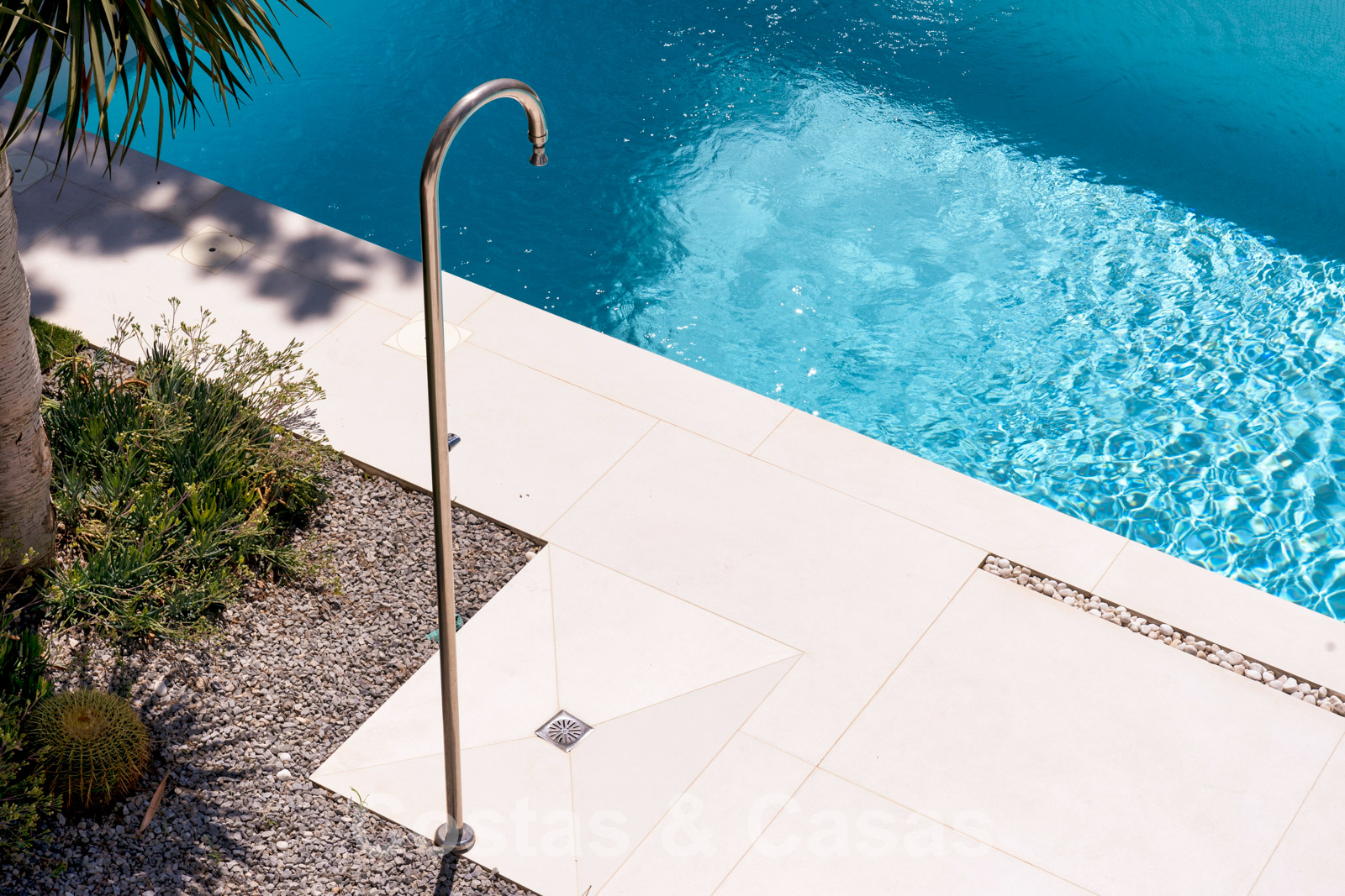 Amplia parcela esquinera totalmente vallada, a la que se accede por una puerta motorizada. Paisajismo de alta calidad con plantas mediterráneas. Piscina rectangular con casita de piscina adyacente que se equipará con un chill-out. Amplias terrazas con zonas relax. Amplio solárium con zona de comedor al aire libre y jacuzzi. Vistas panorámicas al mar Mediterráneo.
