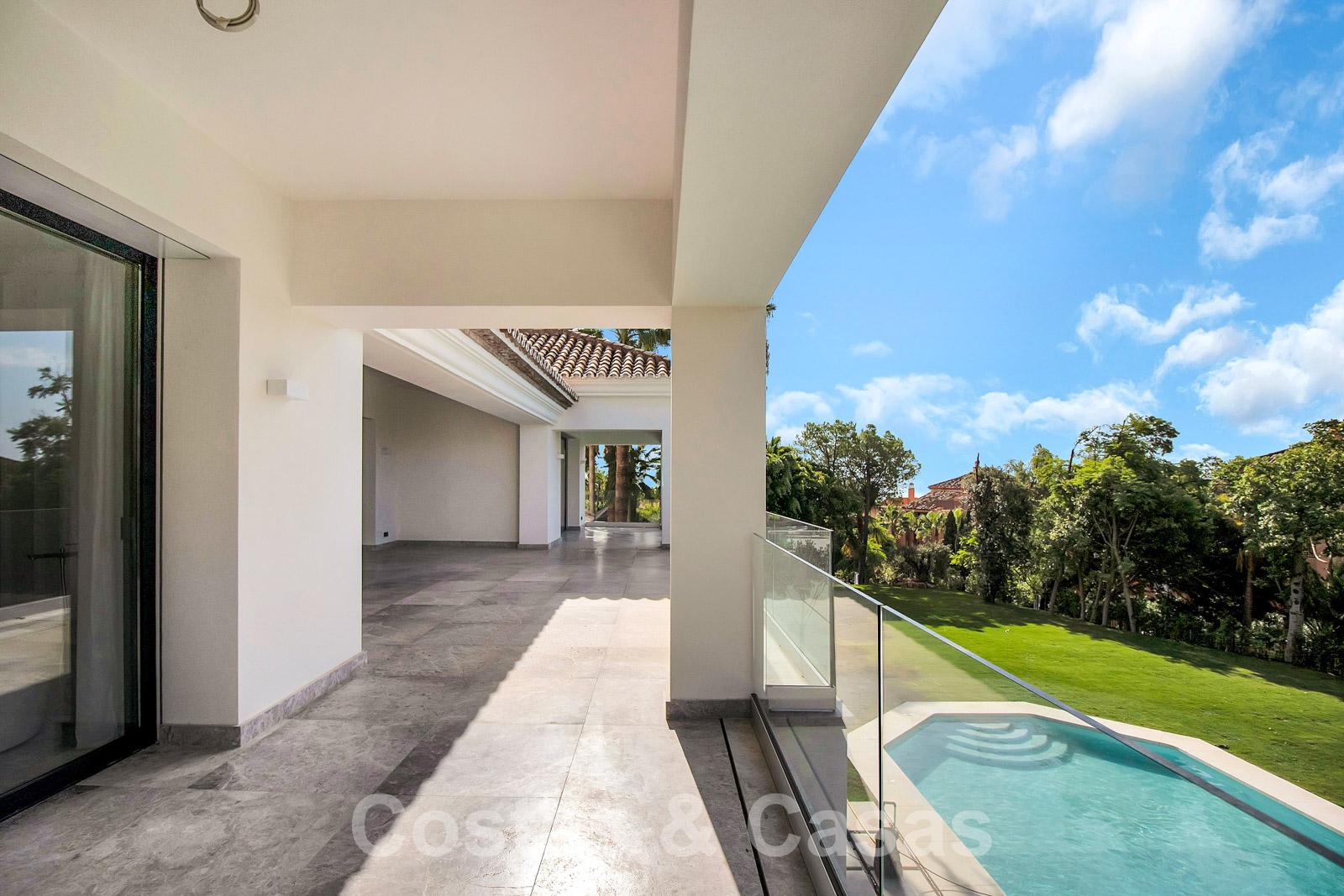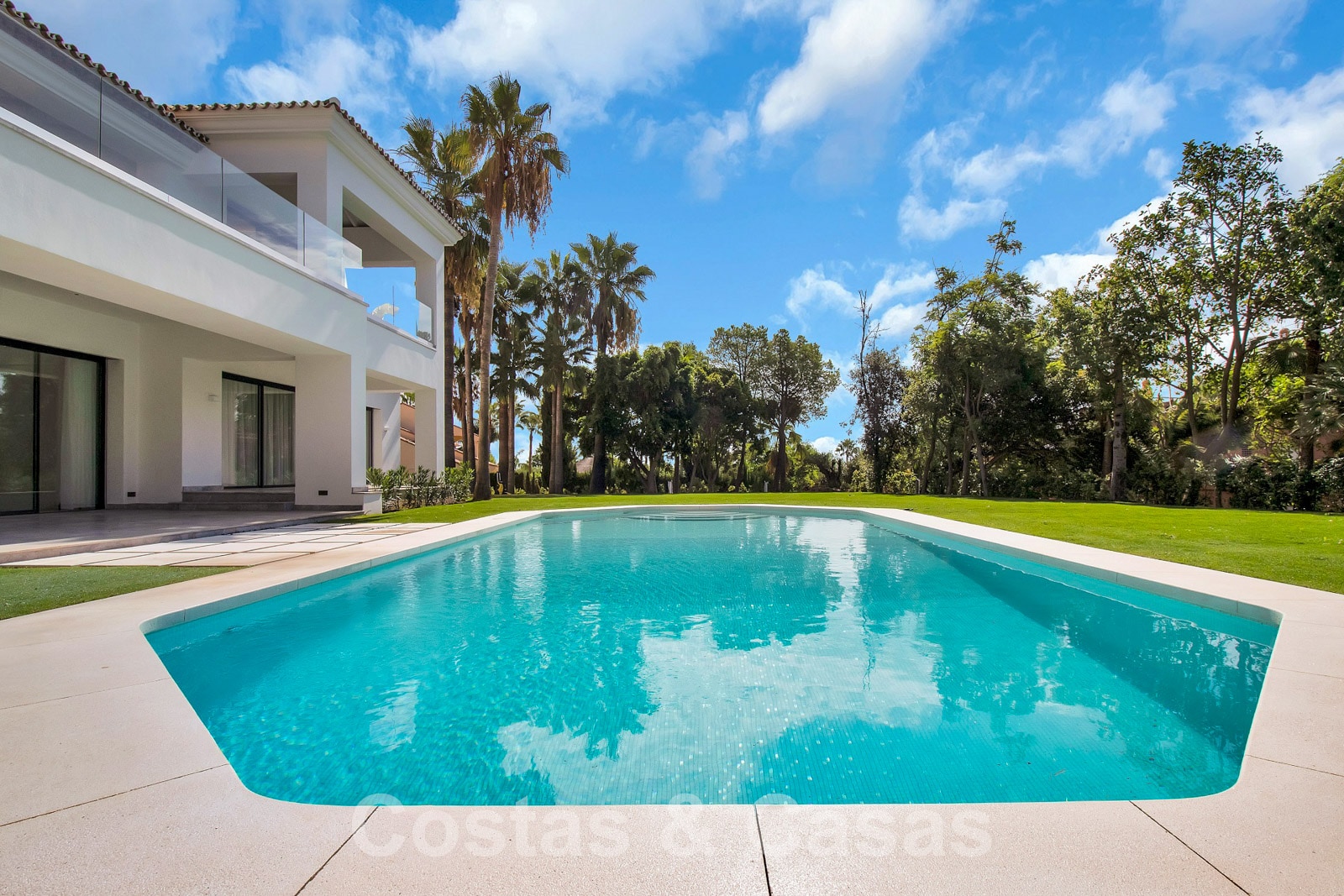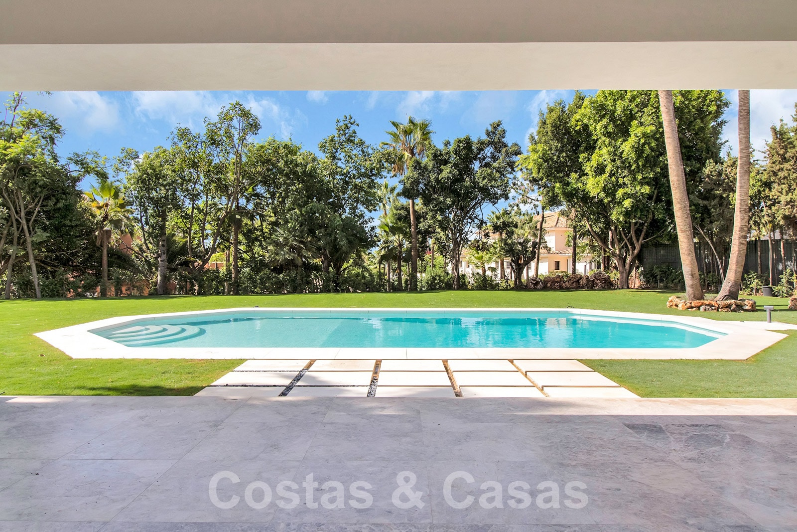 Situada en una amplia parcela con mucha privacidad. Paisajismo de alta calidad con palmeras y vegetación autóctona. Gran piscina rodeada de césped y una terraza adyacente para tomar el sol. Las terrazas cubiertas y descubiertas ofrecen un amplio espacio para el ocio.