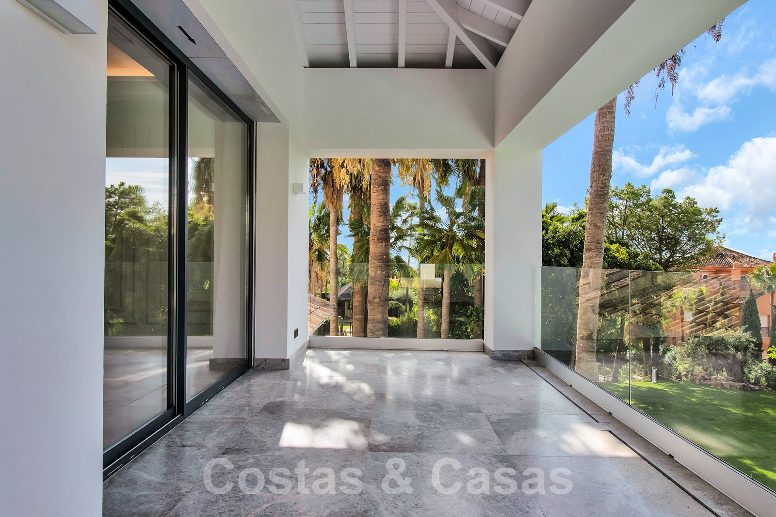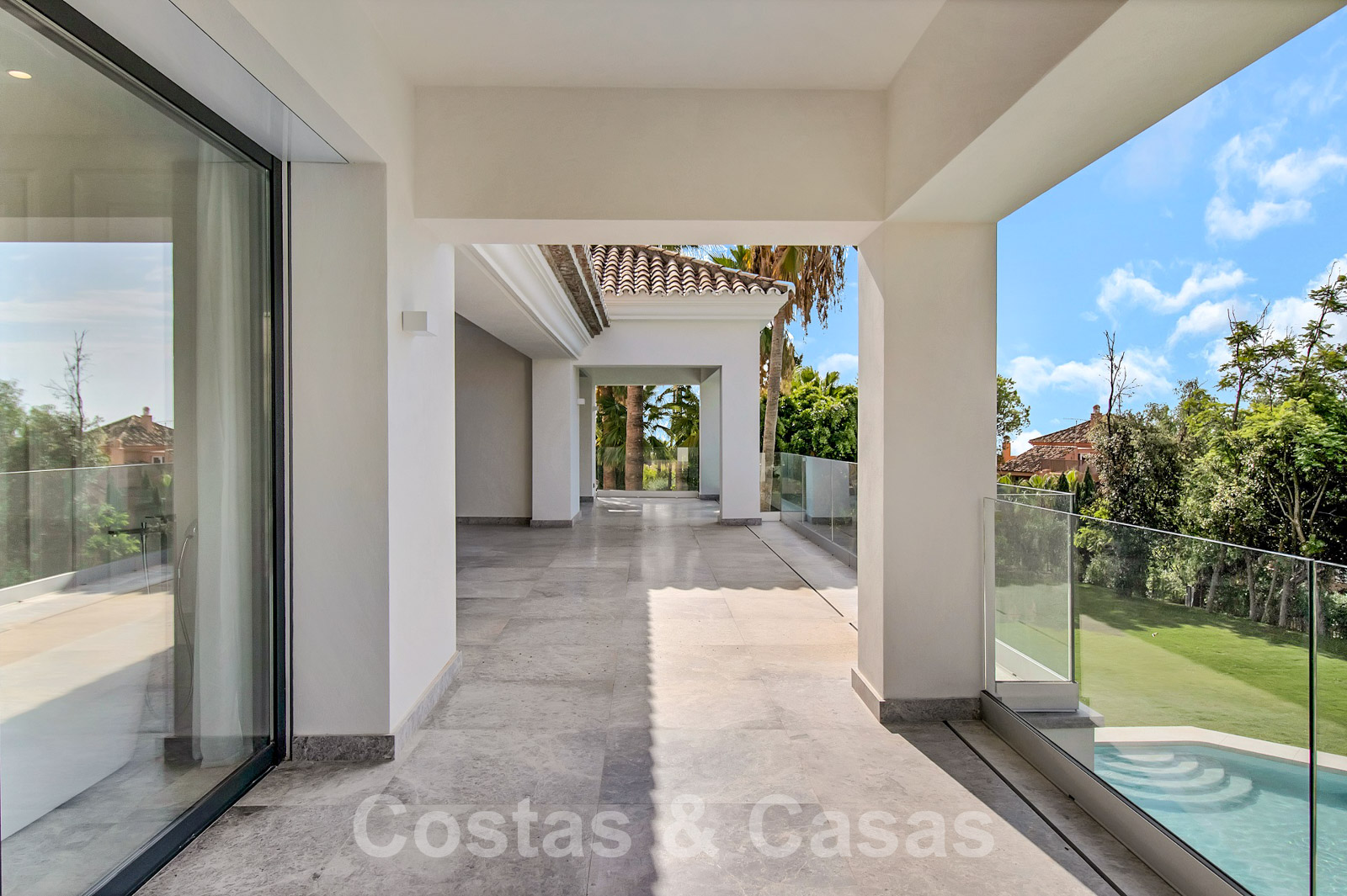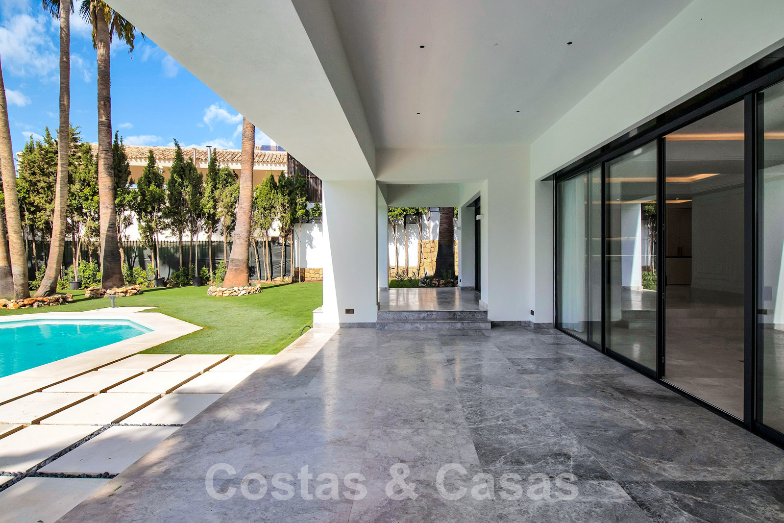 Situada en una amplia parcela con mucha privacidad. Paisajismo de alta calidad con palmeras y vegetación autóctona. Gran piscina rodeada de césped y una terraza adyacente para tomar el sol. Las terrazas cubiertas y descubiertas ofrecen un amplio espacio para el ocio.