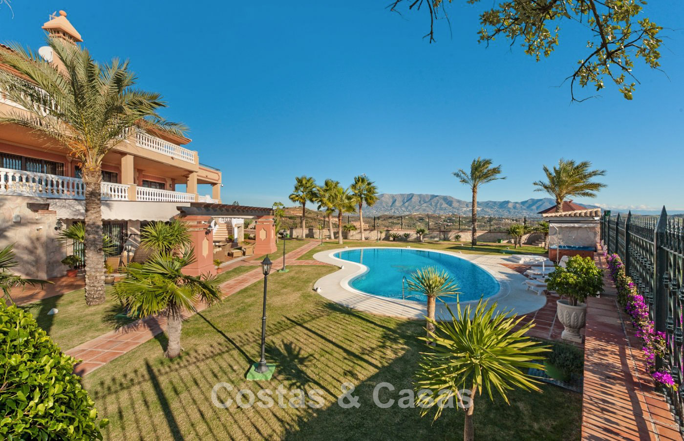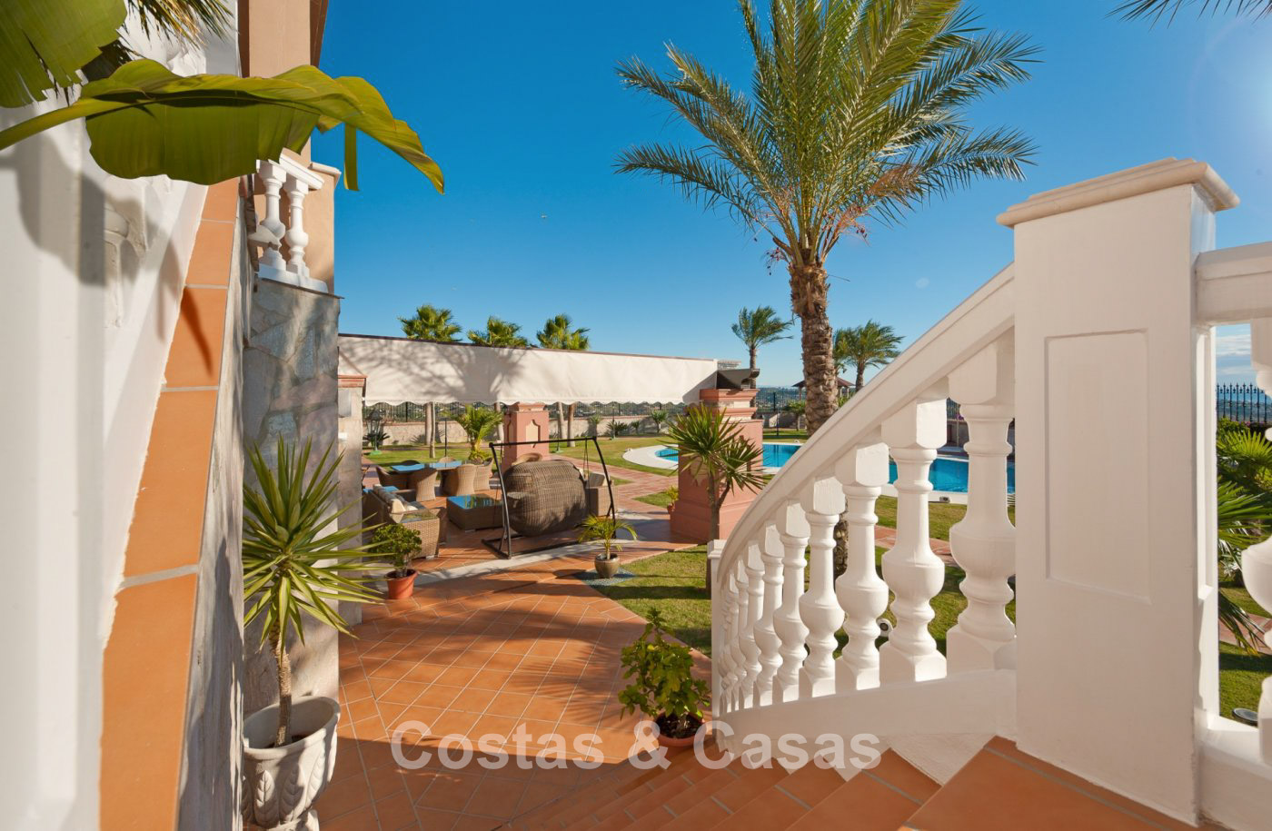 Amplia parcela de más de 3.600m² en posición elevada, junto al campo de golf. Jardín maduro y paisajístico con palmeras y césped. Piscina infinita estilo laguna rodeada de zona para tomar sol. Varias terrazas abiertas y sombreadas ofrecen la oportunidad de disfrutar del agradable clima mediterráneo. Vistas panorámicas de los campos verdes con el mar Mediterráneo al fondo.