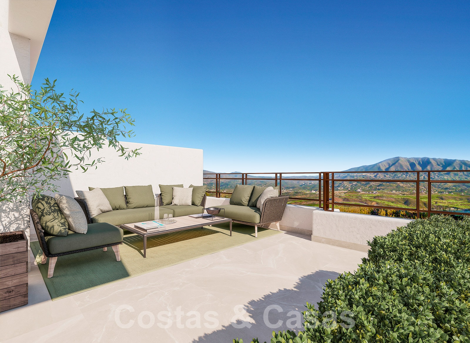 Un amplio solárium con zonas de relax y vistas panorámicas de los alrededores verdes con los campos de golf de La Cala Golf.