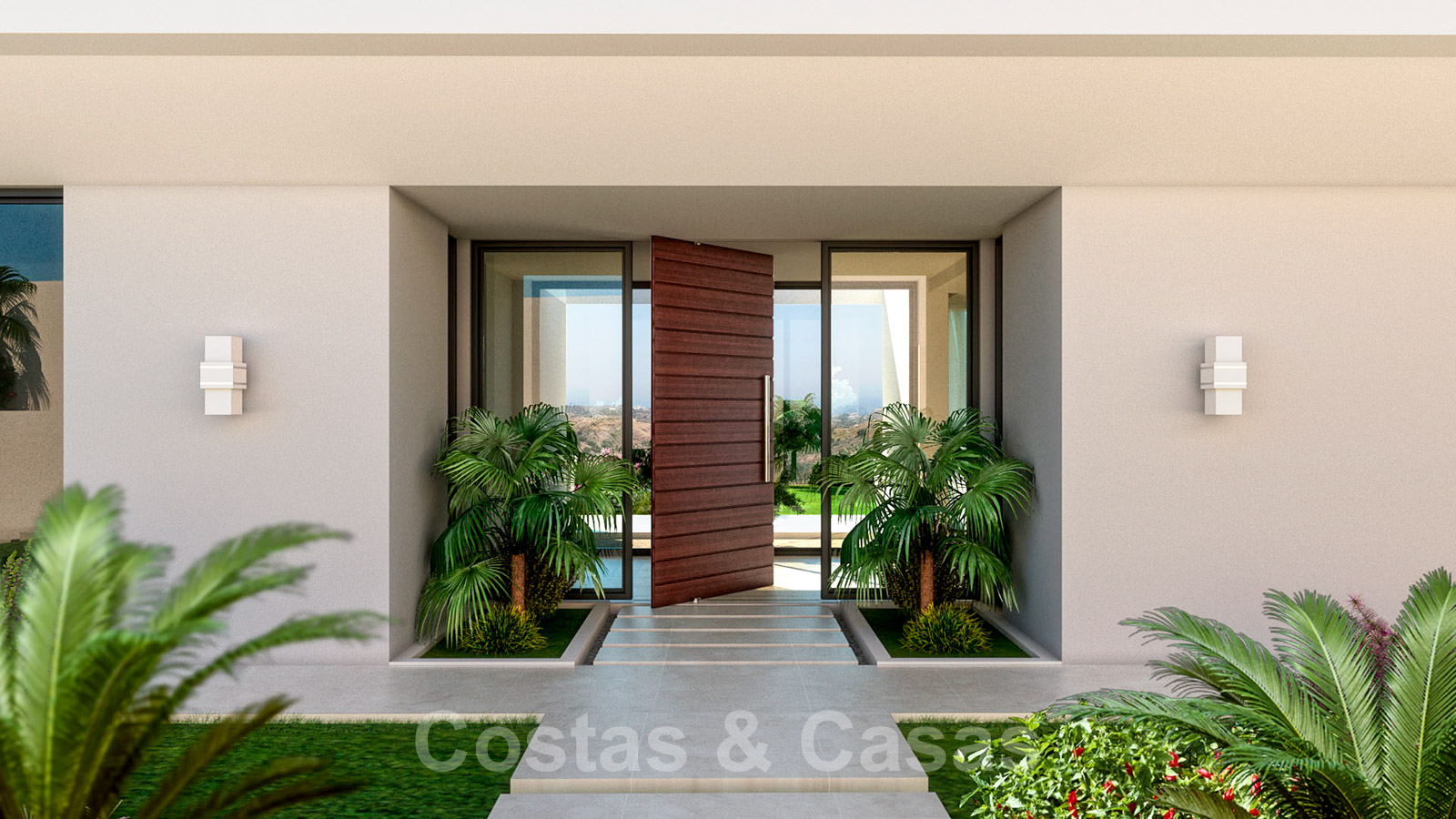 Bonita entrada con puerta de madera.