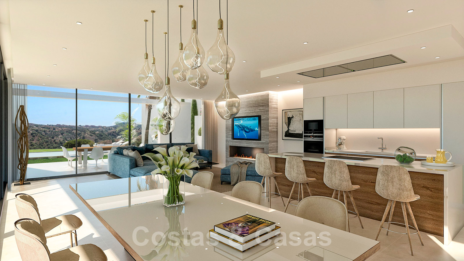 Cocina abierta con isla de cocción con asientos.